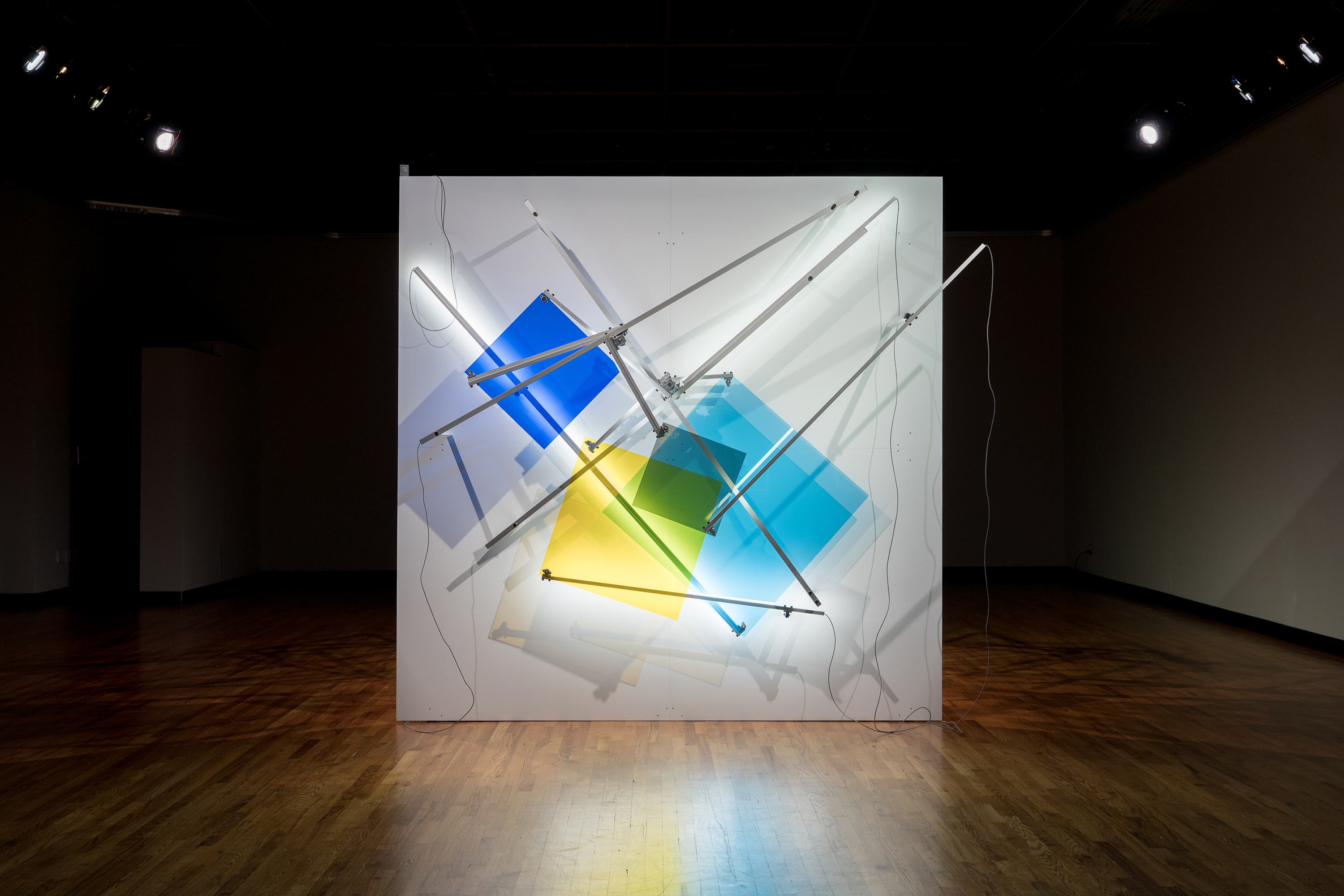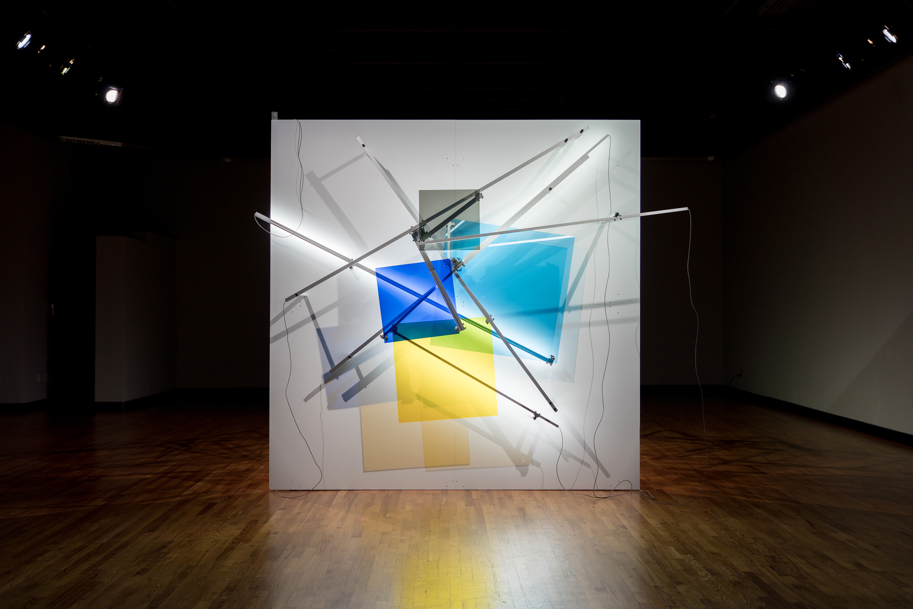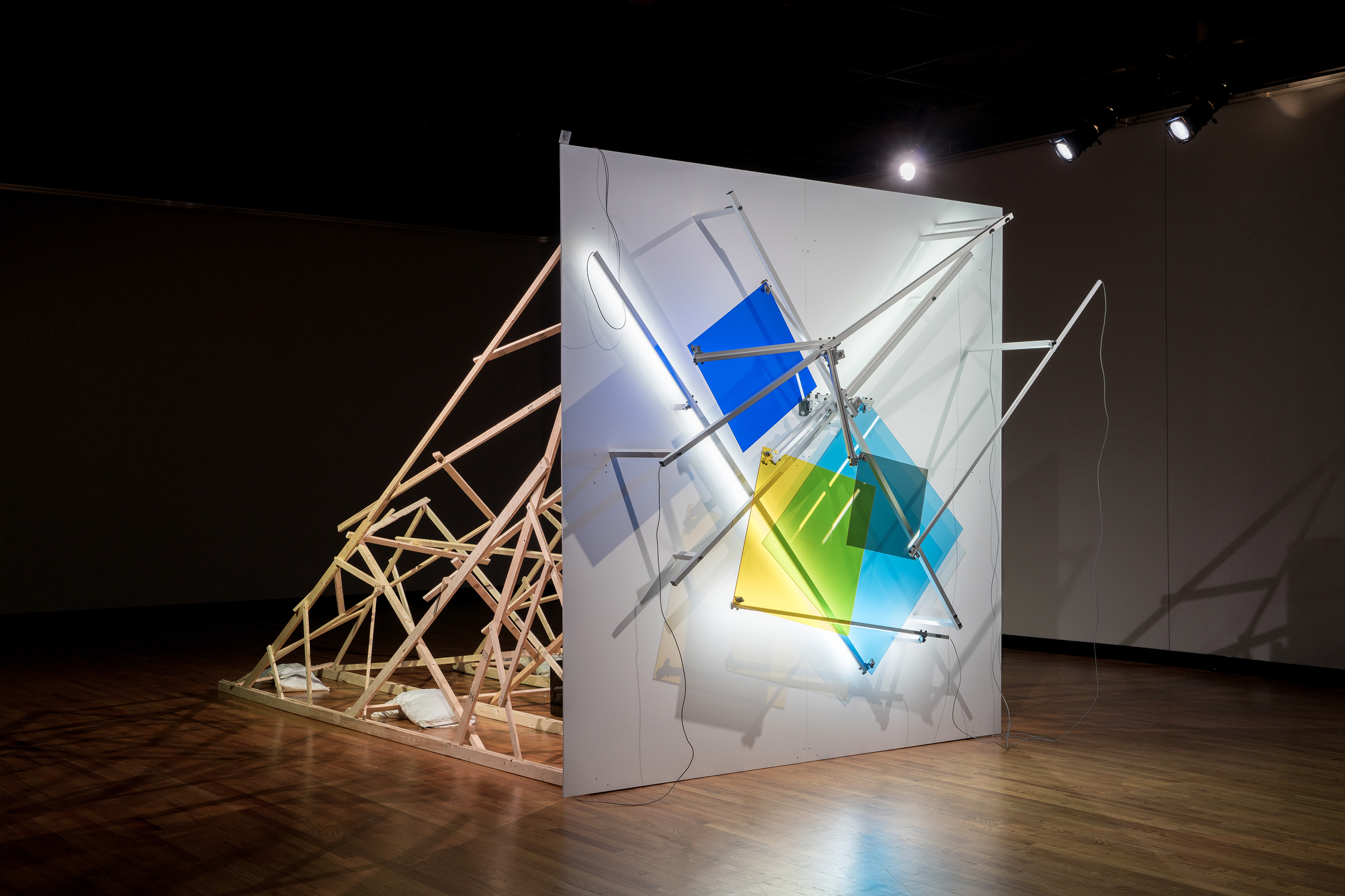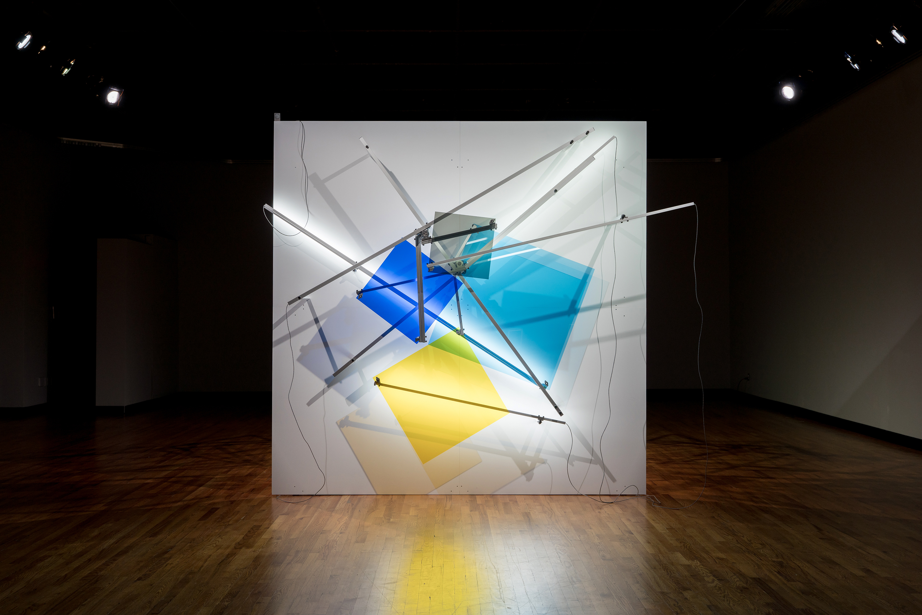As Of Today is a work made up of a structure whose rear support shows an architectural chaos while its foreground is a well-ordered and measured space. On this front surface, a geometrical constellation in a state of weightlessness is unfurled in a bidirectional circular movement; an artificial system where lines, shapes, colours and sounds are juxtaposed and superposed. Through this work we continue to explore the phenomenon of time and space while taking a closer look at the number four, first through its reference to the fourth dimension, then through the basic figure of the square that is reproduced four times and deployed in four different colours. The research on the kinetic and sound meta-geometry examined in recent works expresses our intent of transforming the configurations of imagination by playing on the indetermination of perceptual effects gradually unfolding throughout observation. This tension between rationality and illusion lingers on the uncertainty of a world in constant reconfiguration.