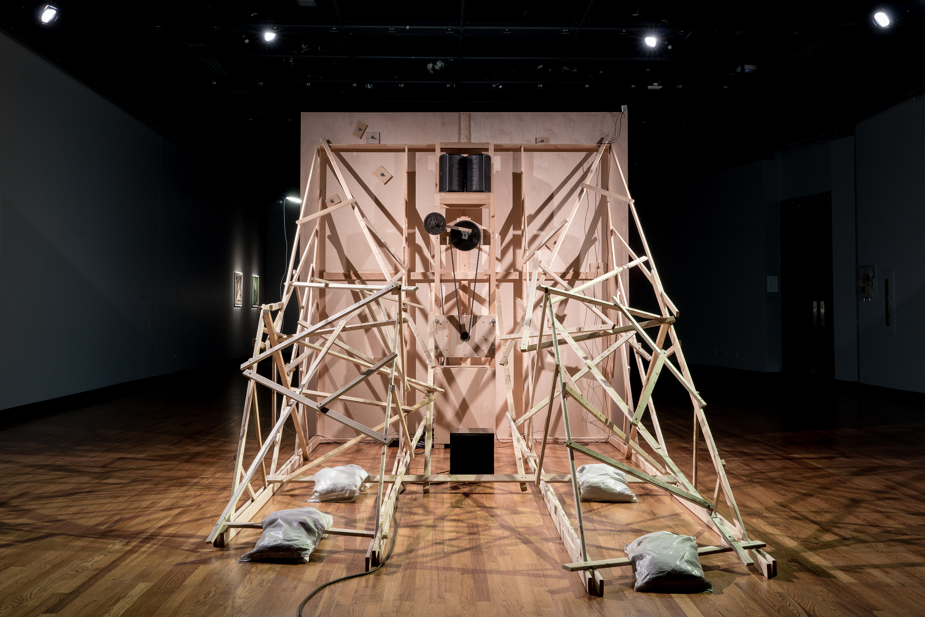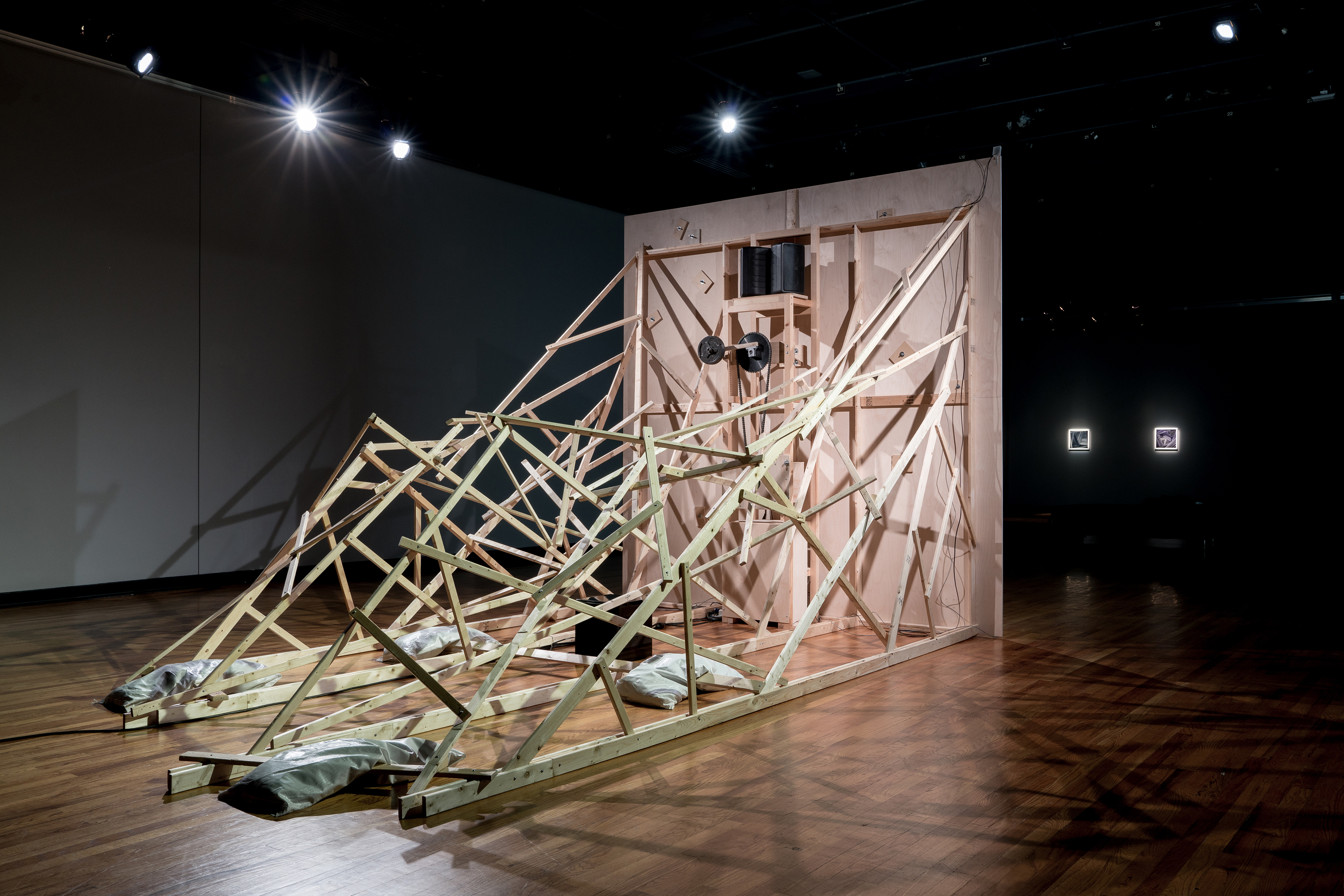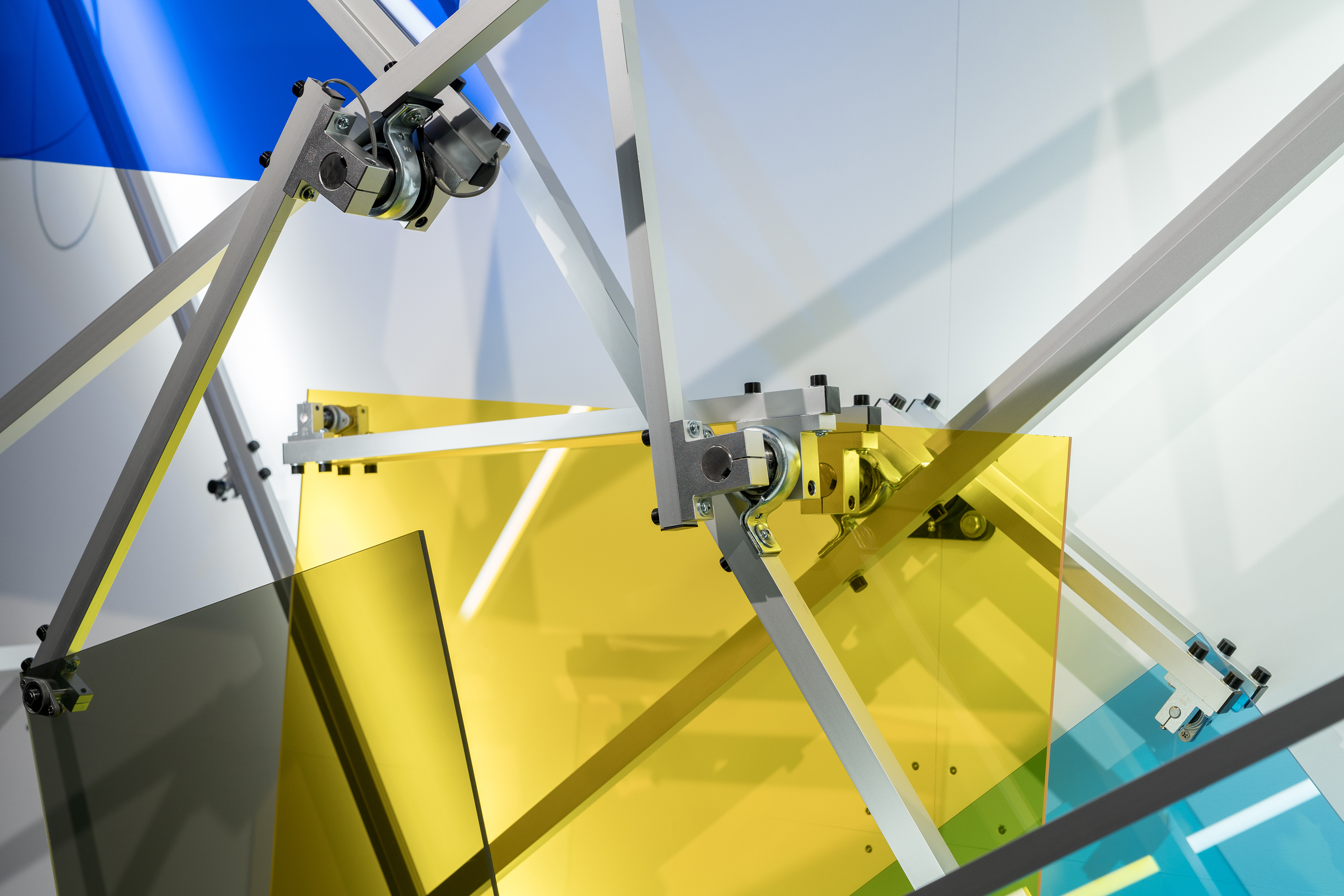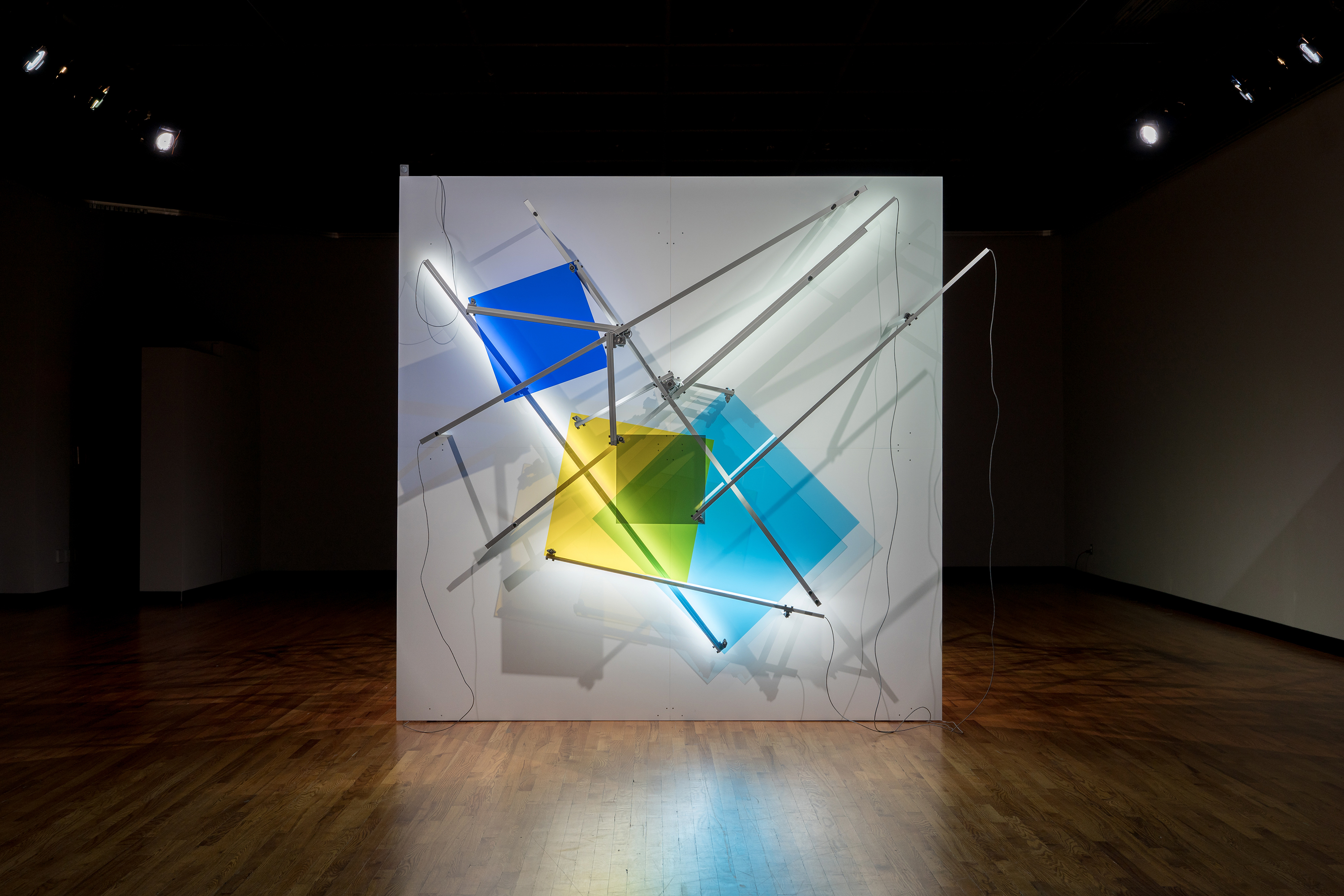 As Of Today is a work made up of a structure whose rear support shows an architectural chaos while its foreground is a well-ordered and measured space. On this front surface, a geometrical constellation in a state of weightlessness is unfurled in a bidirectional circular movement; an artificial system where lines, shapes, colours and sounds are juxtaposed and superposed. Through this work we continue to explore the phenomenon of time and space while taking a closer look at the number four, first through its reference to the fourth dimension, then through the basic figure of the square that is reproduced four times and deployed in four different colours. The research on the kinetic and sound meta-geometry examined in recent works expresses our intent of transforming the configurations of imagination by playing on the indetermination of perceptual effects gradually unfolding throughout observation. This tension between rationality and illusion lingers on the uncertainty of a world in constant reconfiguration.