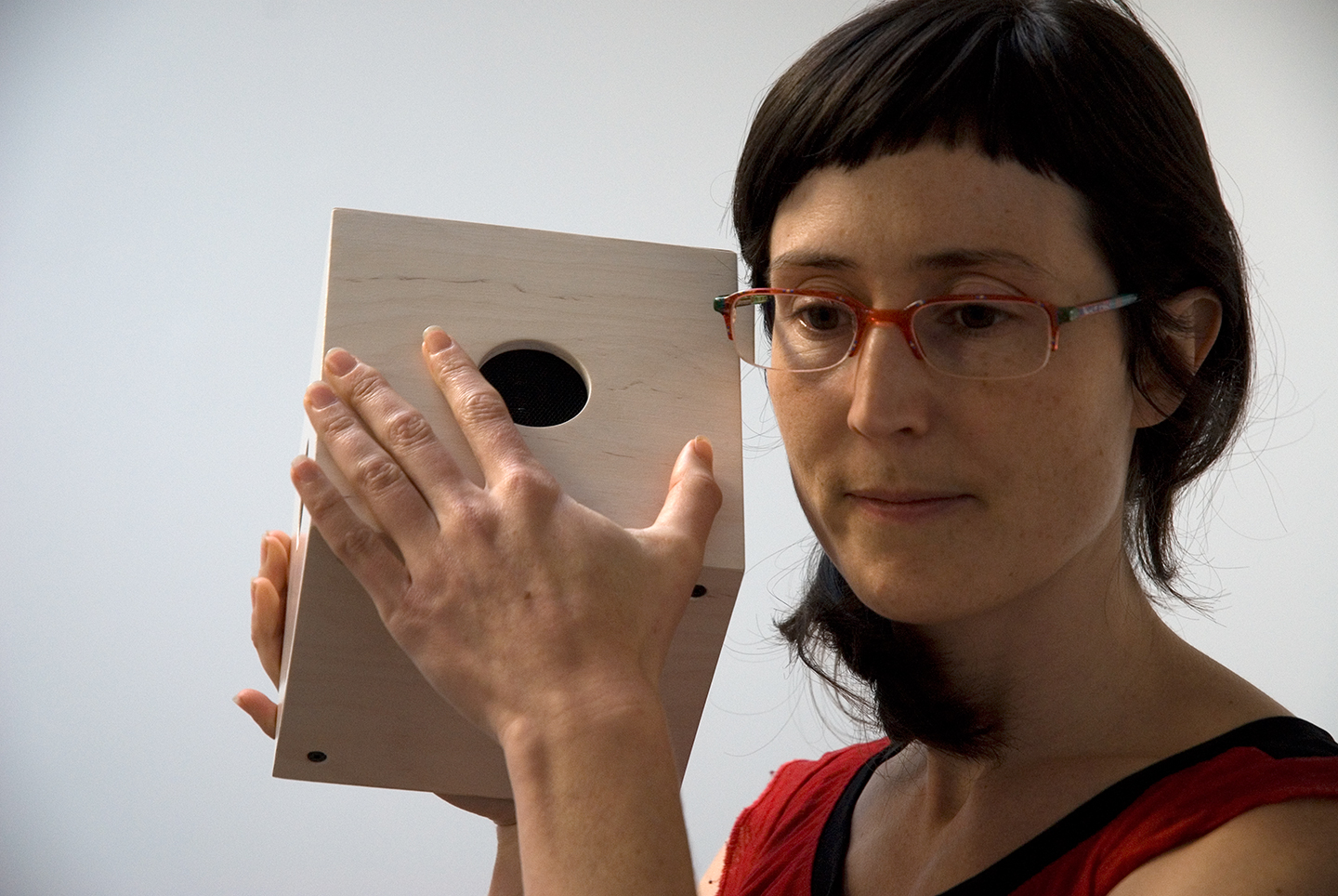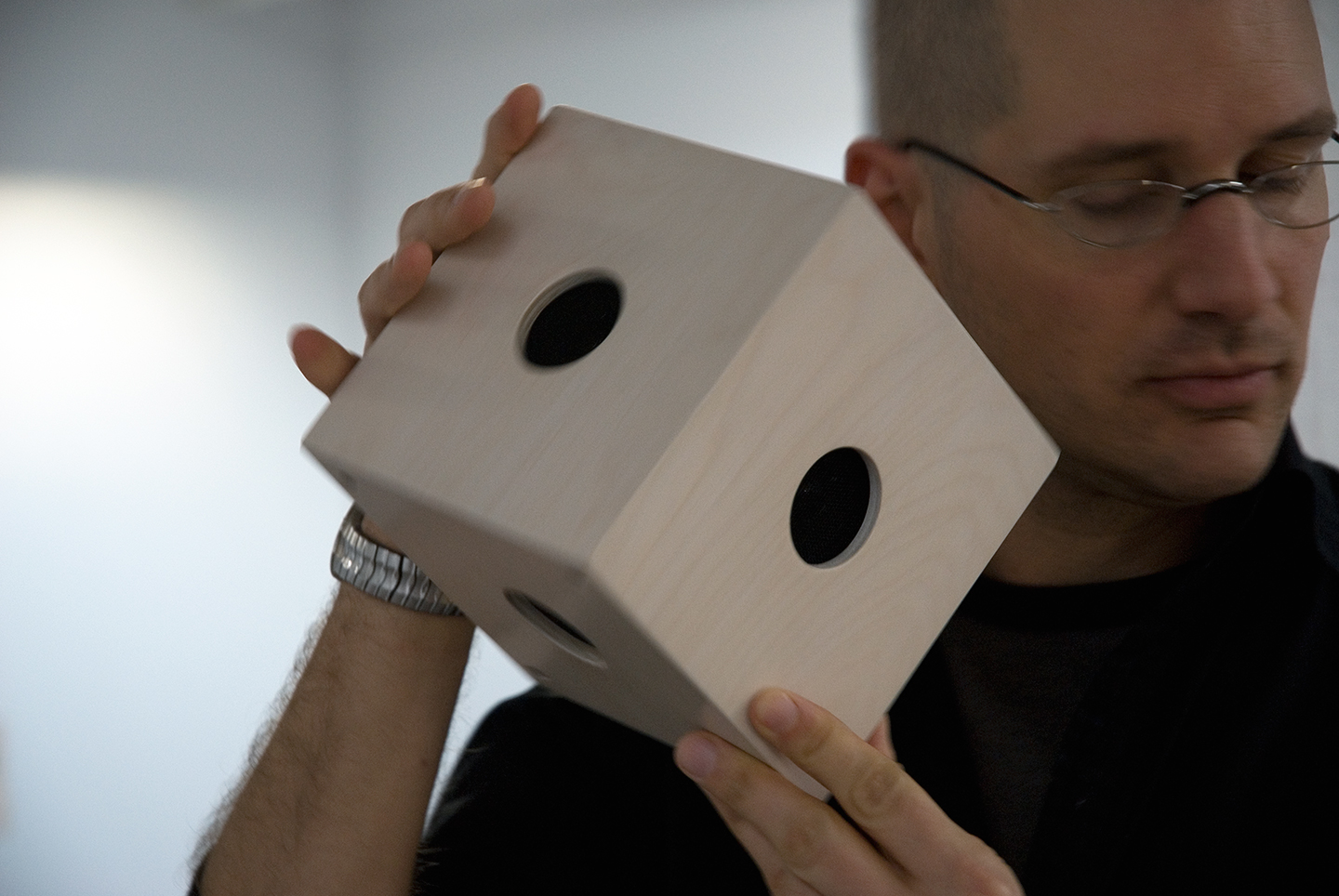 Les Cubes à sons/bruits/babils sont des objets en bois, agréables au toucher, que l’on tient entre ses mains et que l’on tourne et retourne dans tous les sens afin de découvrir leurs contenus. Ils renferment une multitude de sons, de fragments de vie et d’espaces-temps, formant ensemble un vocabulaire acoustique. Au fur et à mesure de la manipulation, il se crée des associations et enchevêtrements de sons imprévus et imprévisibles que l’on peut modeler à son gré. Ainsi se font et se défont des histoires brèves et fugitives réinventées chaque fois, à partir d’un objet tactile, visuel et sonore. Le visiteur vit alors une expérience exploratoire de découvertes ou se révèle à lui une collection de points de vue et d’écoute peu probable dans nos réalités quotidiennes, une sorte de fiction sonore révélée et construite par sa manipulation. Les Cubes à sons/bruits/babils explorent l’immensité du monde emmagasiné dans le miniature, ainsi que les notions du dedans et du dehors. Ils traitent de la mémoire qui oublie, qui se souvient et qui invente, ainsi que de l’être ici dans toute sa présence. Chaque cube contient un dispositif électronique constitué de six canaux indépendants— un canal par face —, de mémoires numériques audio amplifiées et de plusieurs capteurs qui font la lecture de position. Ils sont sans fil et énergétiquement autonomes. En enclenchant la diffusion par sa manipulation, le visiteur devient l’émetteur par le geste, mais également le récepteur par l’écoute et par la perception tactile du son.