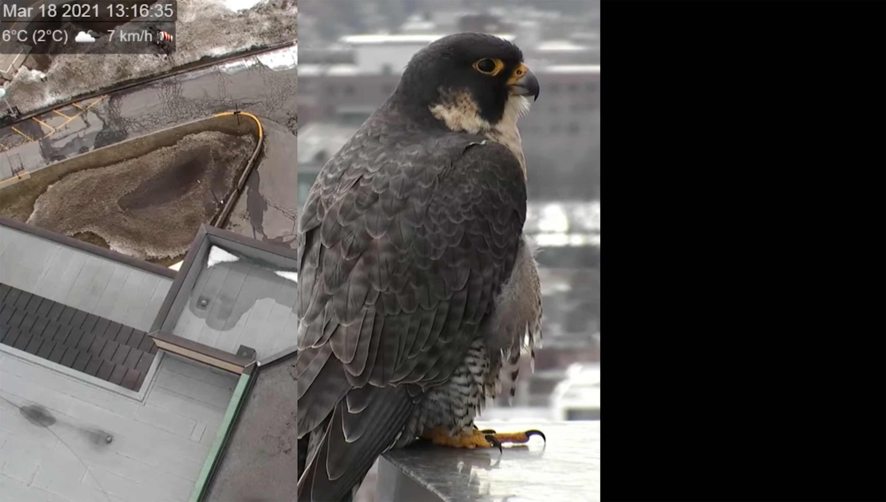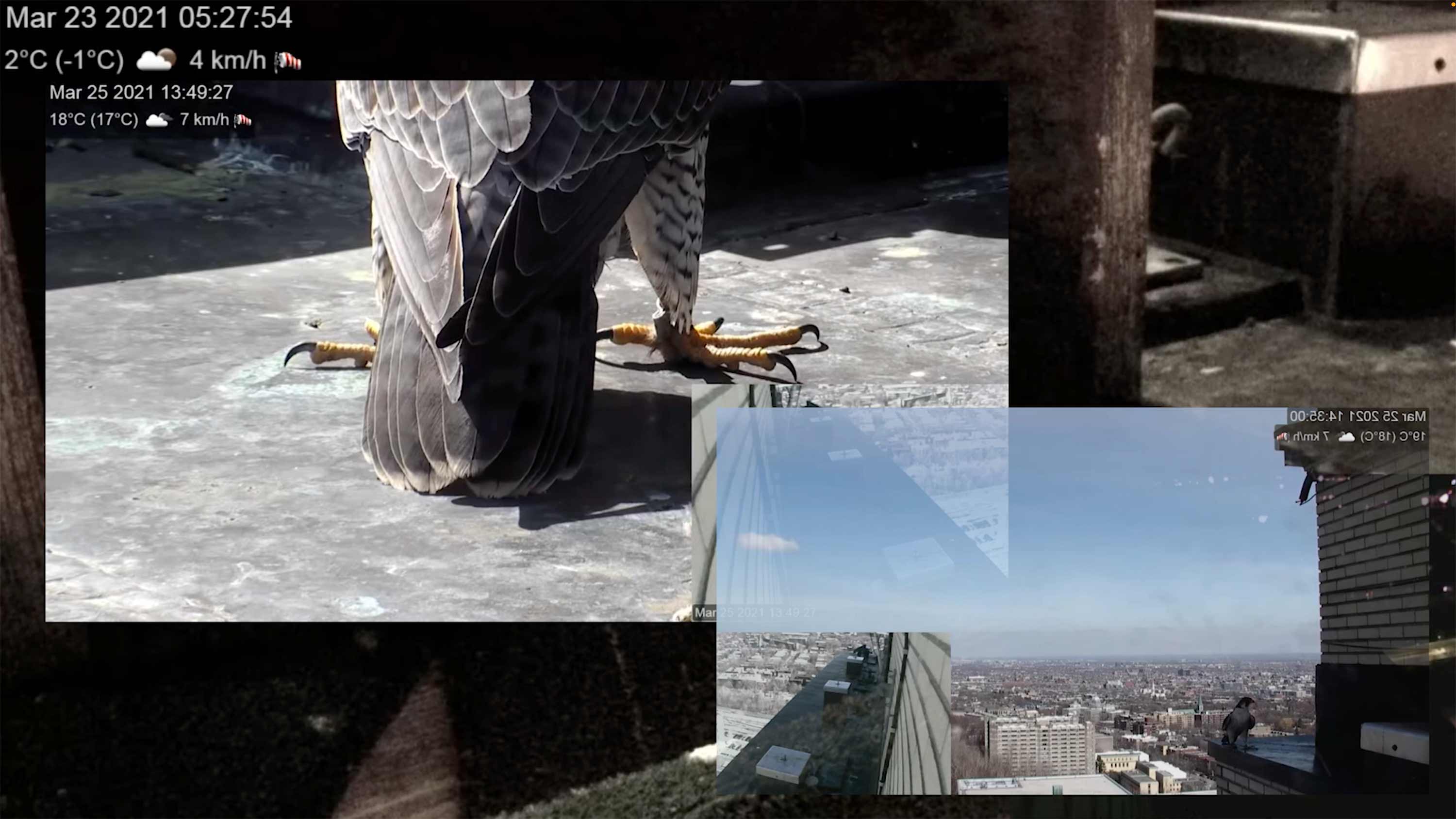 Inspired by the thoughts of Donna J. Haraway, in these troubled and confusing times, we felt the need to connect with a couple of Peregrine falcons that where roosting at the top of the Roger-Gaudry tower at the Université de Montréal. Using three webcams installed near their nest, we observed and recorded them from our computer almost every day from early March to late May, and then occasionally until late October 2021. The video recordings became a point of contact with these birds saved from the threat of extinction thanks to the ban on the use of DDT (in Canada and elsewhere). We were captivated by the life of these urban birds of prey, their unique space-time, and how they live in their temporary habitat. One of our main interests was to observe how they survive in this anthropogenic place devoid of vegetation. Their nesting area with the city as backdrop, in a place saturated with human expansion, formed a strange and reassuring image all at once. Their presence in this place emphasized the tension between different temporalities: a production-oriented human time and a rhythm specific to falcons.