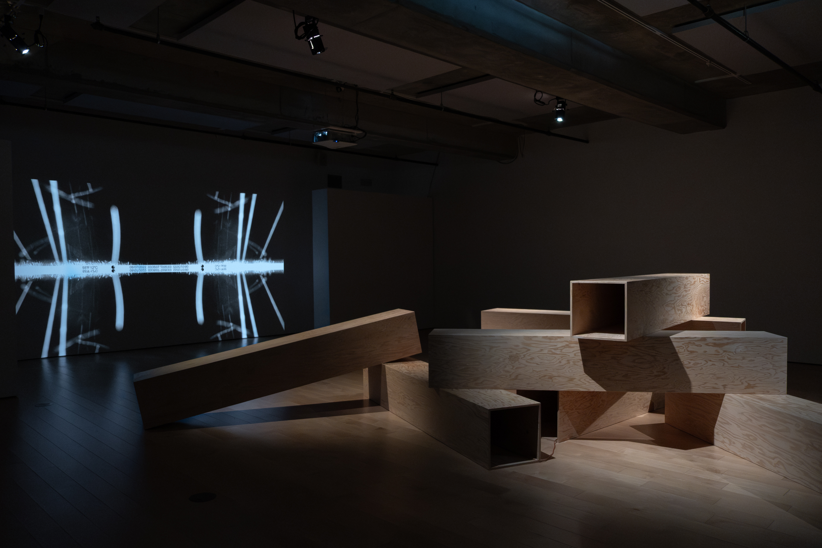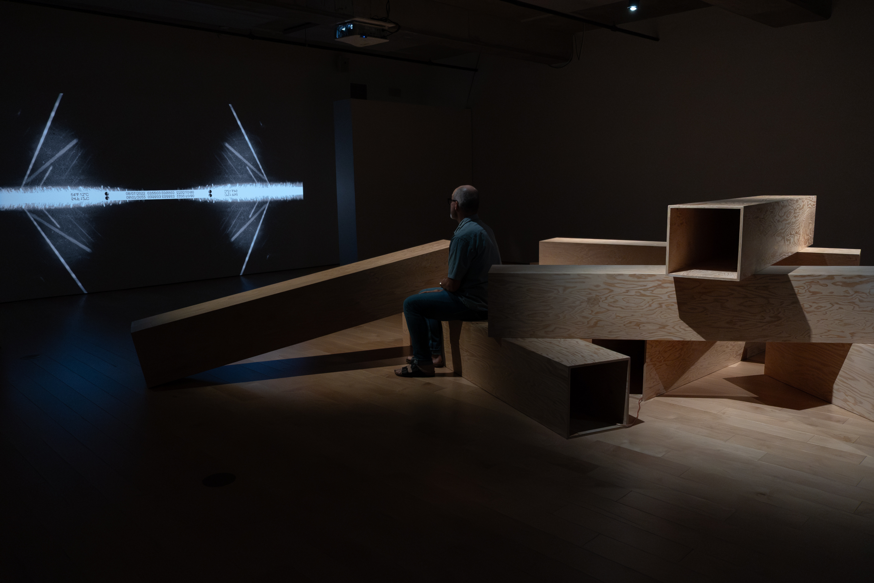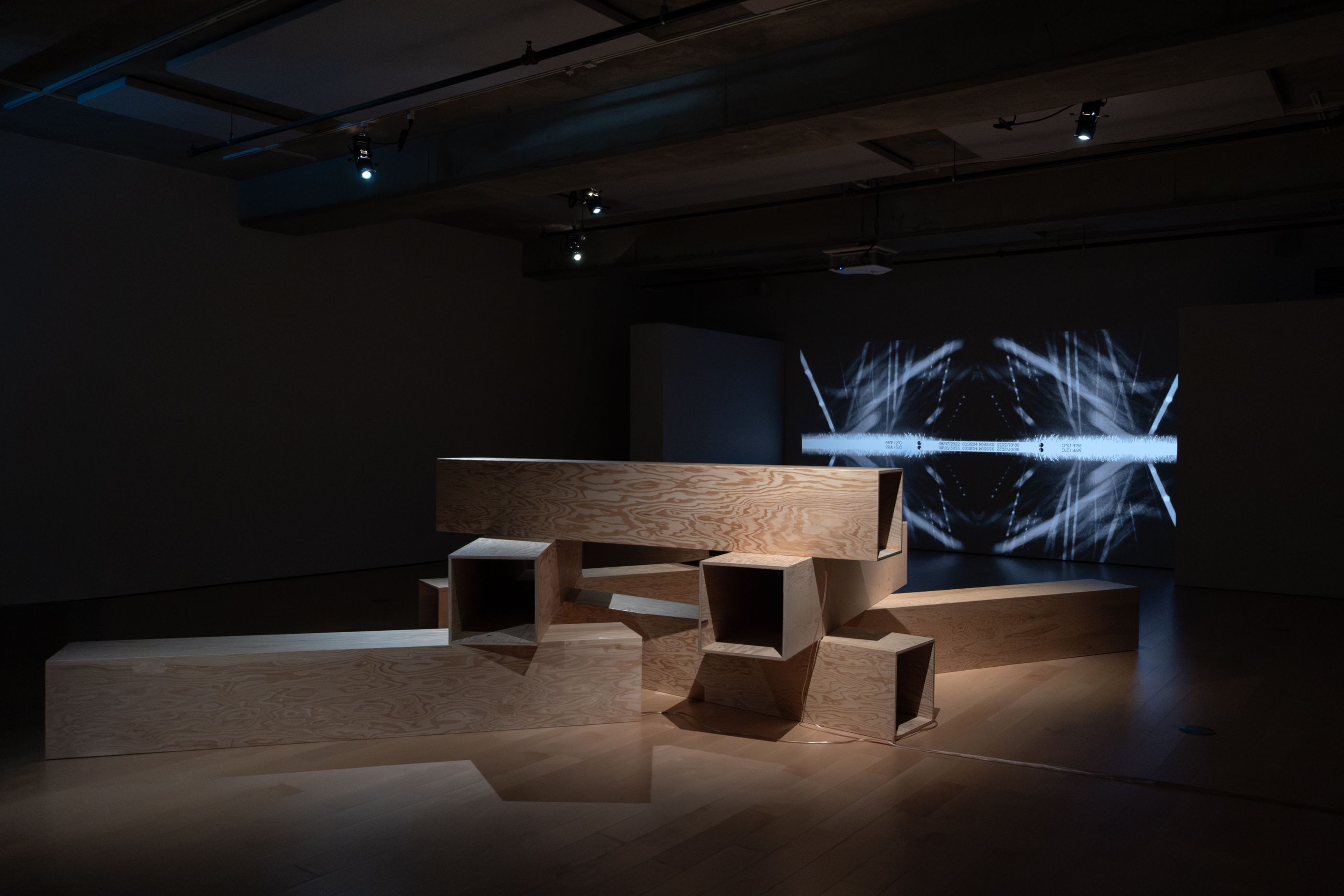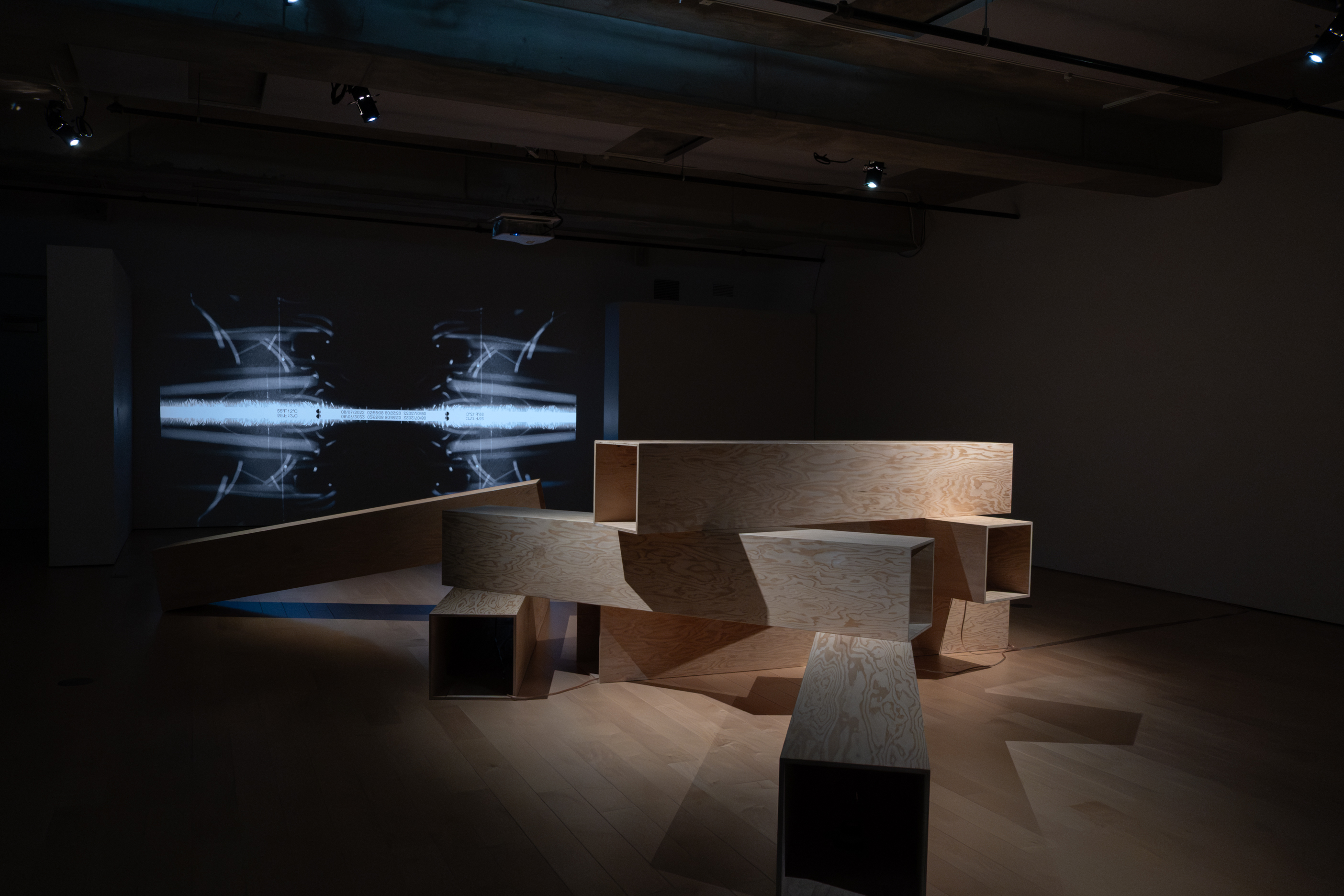 With their new installation Invariable variations, the Béchard Hudon artist duo continues their exploration of infrasound and underwater sounds while also investigating the spectra of the visible imperceptible to the human eye. The installation is composed of a haptic sound sculpture and a video, providing an opportunity for a moment of attention that calls upon the acuity of listening and observation. Visitors enter a space filled with the sound of the deep and resonant « voices » of the ground and the sea originating from different protected environments of the Magdalen Islands, where the artists made their recordings. A polyphonic composition gradually transforms the entire sculpture, on which people can sit for a listening experience where the vibrations are felt directly through the body, summoning both the visceral and the universal.