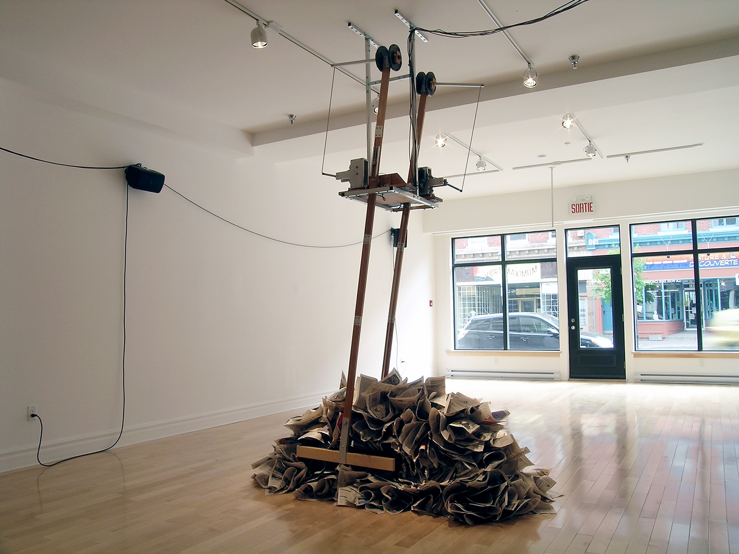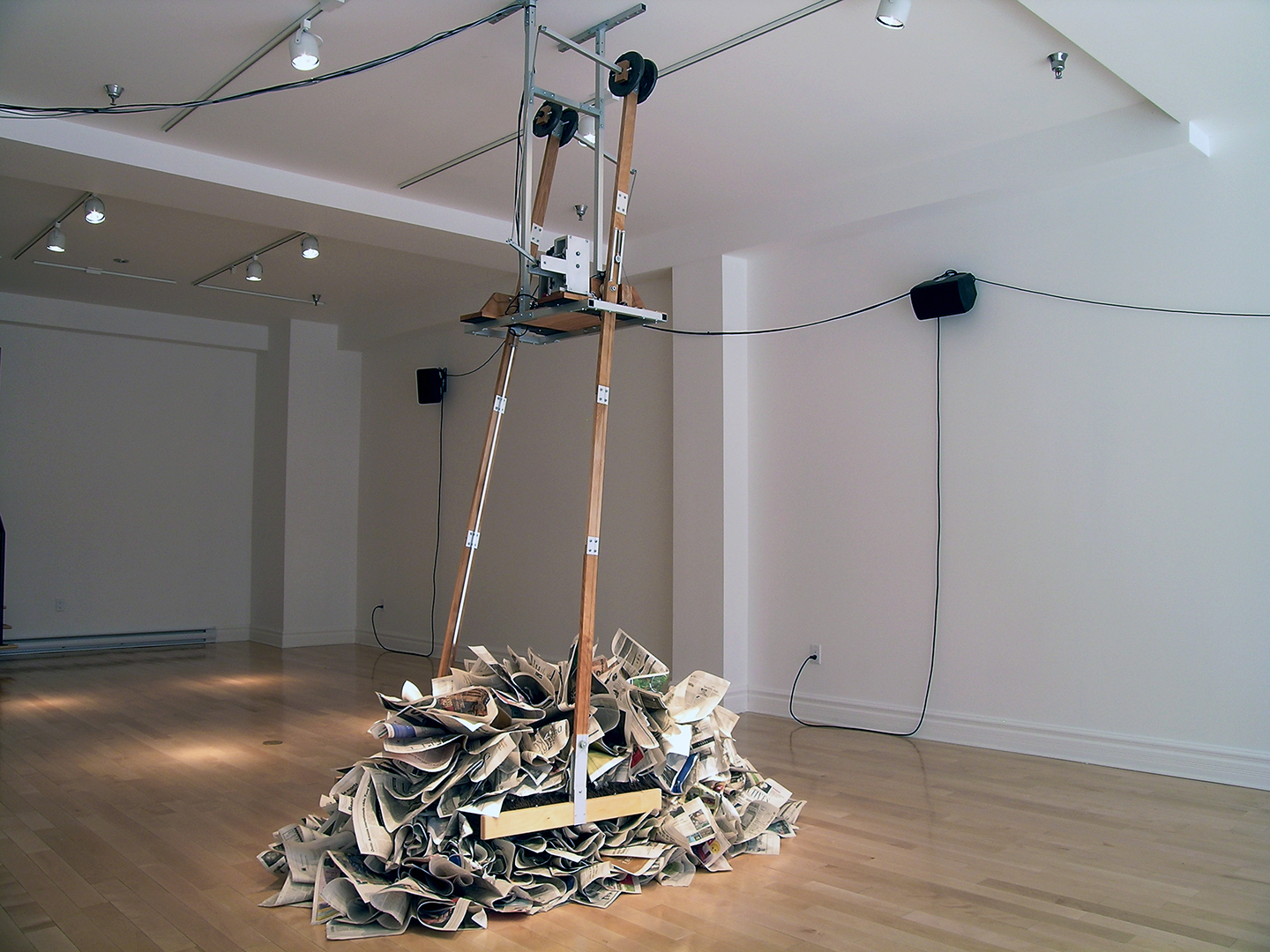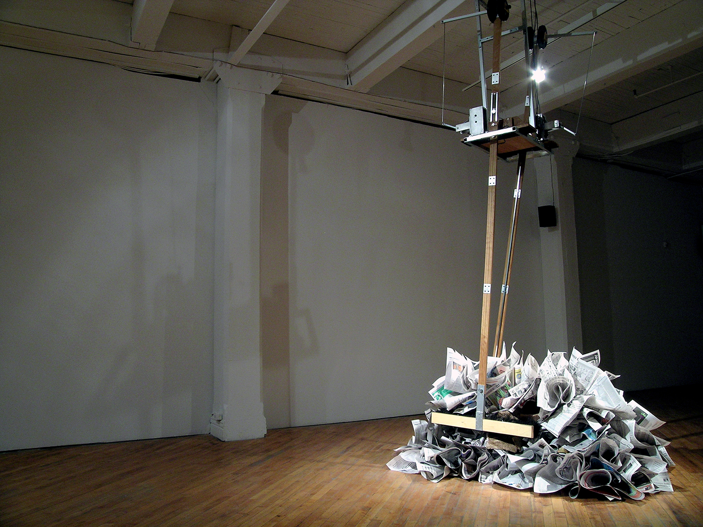Two huge, oversized mechanized brooms are suspended and begin to move in a swinging motion. Their at times very slow rhythm gives us the impression of being suspended in time, and their larger than life scale imparts a sense of fragility and a loss of balance. As they pass by they rub and scratch against a heap of newspapers. Microphones inserted inside their brushes capture the vibrations of the paper and a wave scan then reveals the “noise music” potential of these everyday materials. The newspapers and brushes also become “sound objects” and they make themselves heard in an insistent cacophony. A rumbling that becomes incessant and fragile through the movement of the set-up.
