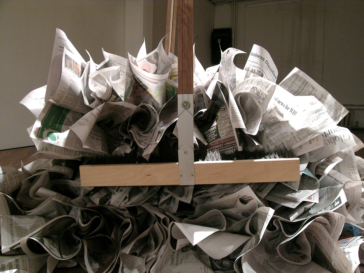 Au milieu d’un espace, deux immenses balais mécaniques, plus grands que l’échelle humaine, sont suspendus et s’animent dans un mouvement de balancier. Leurs rythmes, parfois très lents, nous donnent l’impression d’être suspendus dans le temps et leurs démesures, un sentiment de fragilité et une perte d’équilibre. Au passage, ils frottent et grattent un amoncellement de papiers journal. Des microphones insérés dans les brosses captent les vibrations du papier et s’ensuit un balayage d’ondes qui nous révèlent le potentiel « bruitiste » de ces matériaux que nous côtoyons tous les jours. Les journaux et les brosses deviennent ainsi « objets sonores » et ils s’entendent en une cacophonie lancinante. Une rumeur qui se fait incessante et fragile par le mouvement du dispositif.