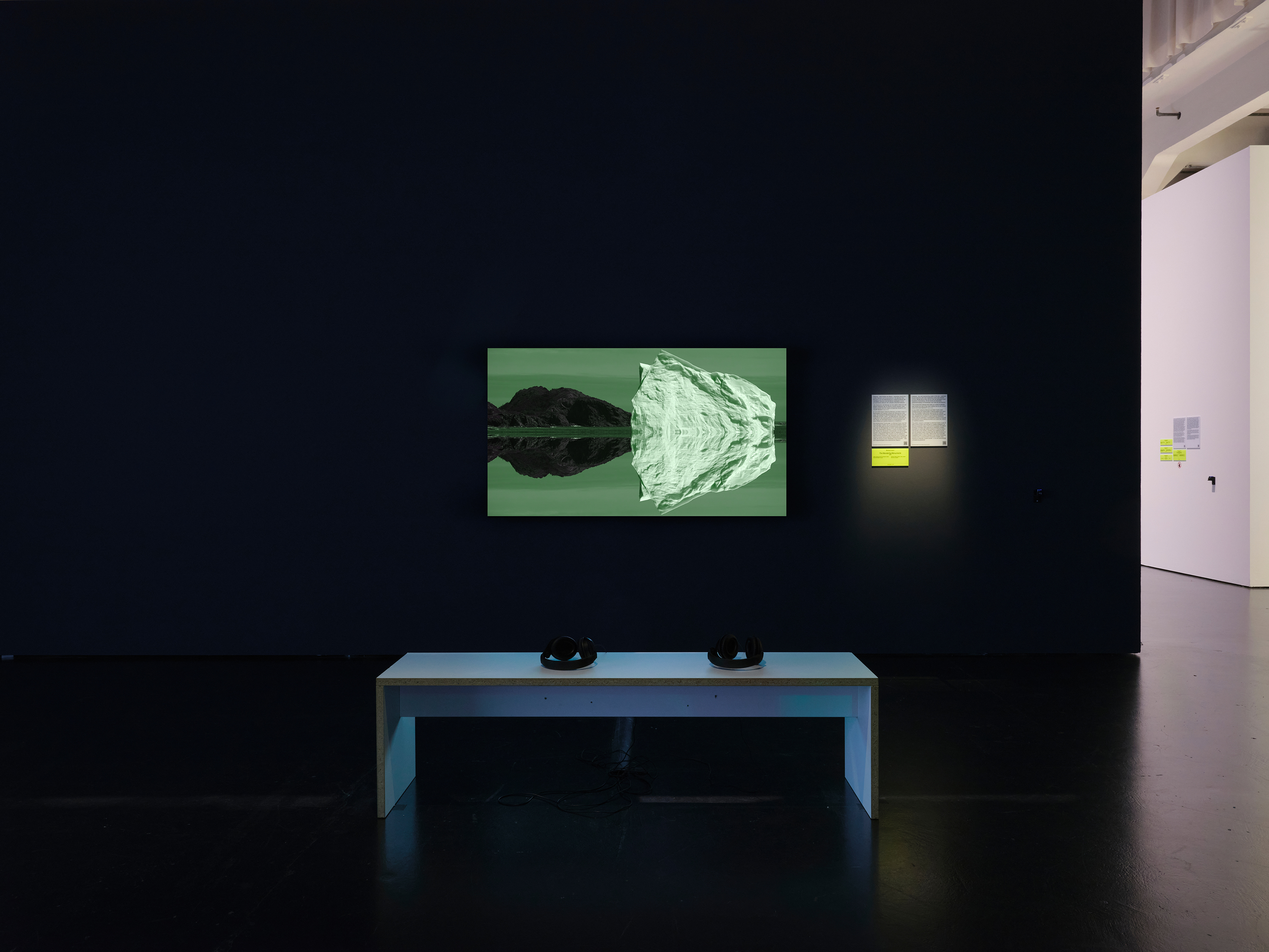 Icebergs – the cold mesmerizing matter of the sea – captivate human attention with their magnitude, purity, and richness of form. Mirage-like as they may be, they are geological manifestations of persistency. Yet the blocks are becoming ephemeral beings, as Promethean man fuels the atmosphere. “The sounds that icebergs emit make up a varied vocabulary that travels from bay to bay. Each iceberg has its own unique sound and visual signature.” (Béchard Hudon). In June 2023, Catherine Béchard and Sabin Hudon were traveling along the Iceberg Alley in Newfoundland and Labrador. The Canadian media artists approached the icebergs with hydrophones, microphones, and geophones (seismic sensors designed by the artists to capture ground vibrations). These tools are essential in oceanographic research to forecast the dynamics of ice-melting processes and model their effects on maritime systems. The artistic research undertaken by Béchard Hudon is part of their current project that will lead to a spatial installation. As the first production stage of this work-in-progress, the ZKM is showing a montage video featuring an artistically modified monolith as a seemingly affixed sculpture in flowing waters. The transfer of the sizzling, crackling, and creaking sounds into the exhibition space contrasts with the silent presence of the iceberg shown in the video. What at first may sound like meditative tunes of nature intensify in the course of listening and becomes a communicative encounter of depth. Does sensing an enigmatic consent prevail – or do we acknowledge a threatening gnawing? (Anett Holzheid)